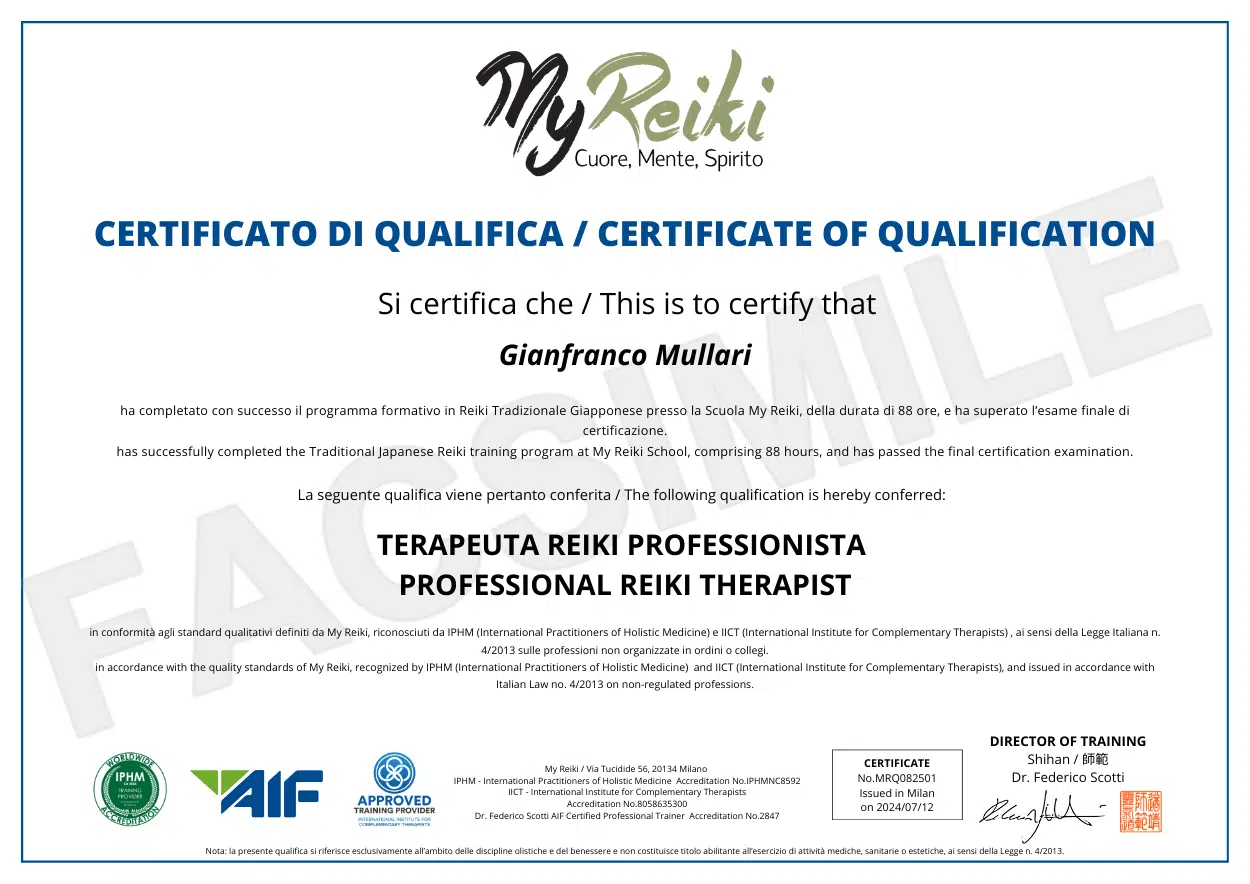 La certificazione rappresenta un momento di sintesi, riflessione e riconoscimento del percorso compiuto. Dopo undici giornate di formazione teorico-pratica, l’esame finale permette di attestare le competenze e le conoscenze maturate nel Reiki Tradizionale Giapponese e ottenere la qualifica di Terapeuta Reiki Professionista in un contesto che valorizza tanto la precisione tecnica quanto la consapevolezza interiore.